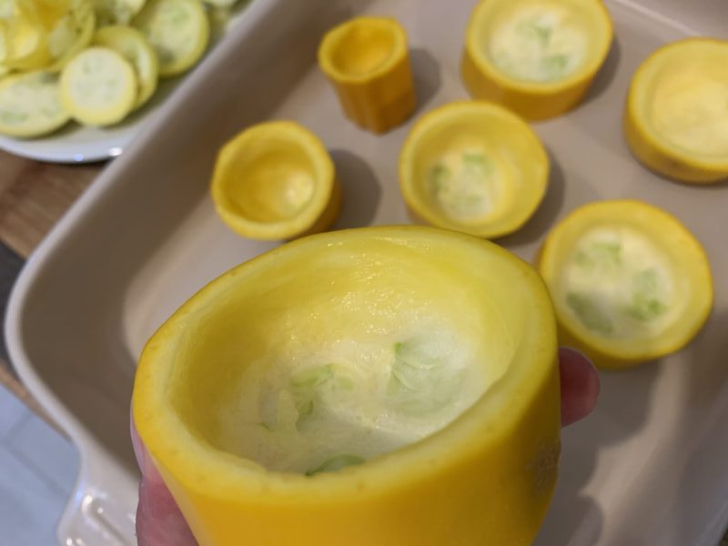 Mit einem Teelöffel nun jedes Zucchini-Stück zu ca. 2/3 aushöhlen. Mit Salz, Pfeffer und Olivenöl von allen Seiten bestreichen (das geht mit den Händen am schnellsten) und dann mit der offenen Seite nach oben auf ein Backblech mit Backpapier stellen. Im vorgeheizten Ofen für ca. 10 Minuten backen.