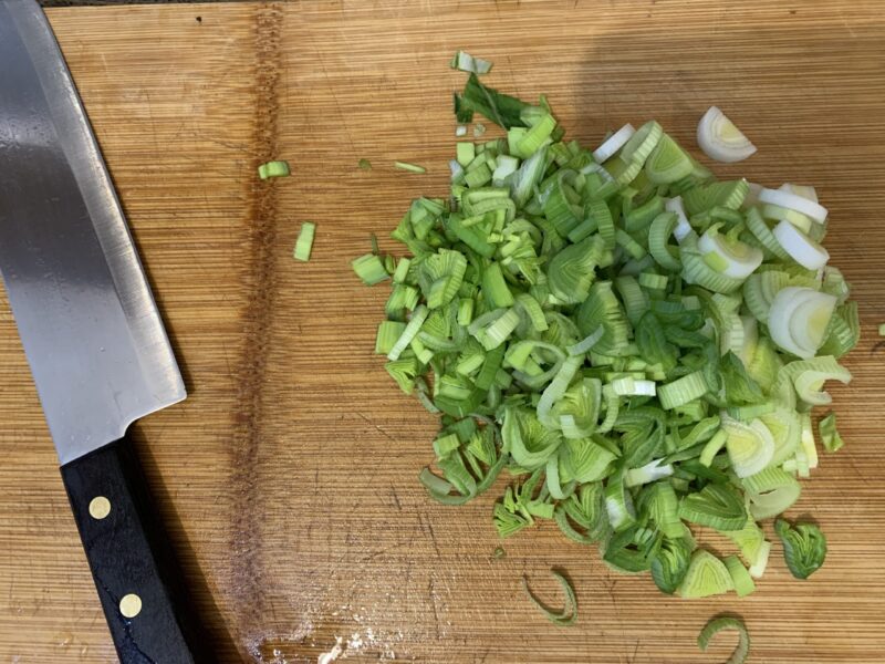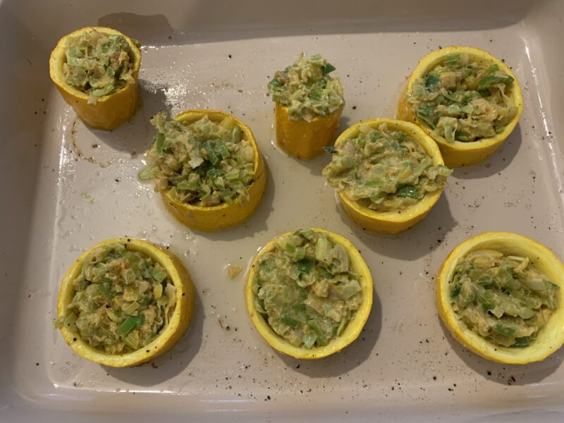 Den Lauch putzen, längs halbieren und in Stückchen schneiden. Den Zucchini-Inhalt grob hacken. Beides zusammen mit etwas Öl in eine Pfanne geben, würzen (Salz, Pfeffer, Kräuter) und leicht anbraten, während die Zucchini im Ofen ist.