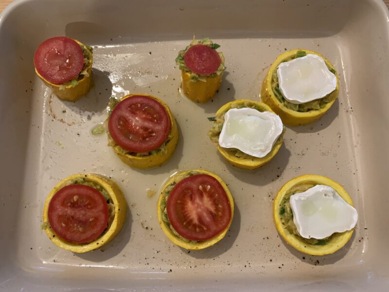 - Sobald die Zucchini im Ofen gut vorgegart ist, nehmt das Blech aus dem Ofen (der bleibt an!) und füllt mit einem Löffel eure Zucchini-Lauch-Mischung in die Zucchini. Oben drauf kommt nun eine Scheibe Tomate und/oder Käse. Bei der Tomate gerne noch etwas Olivenöl und Salz dazugeben.
